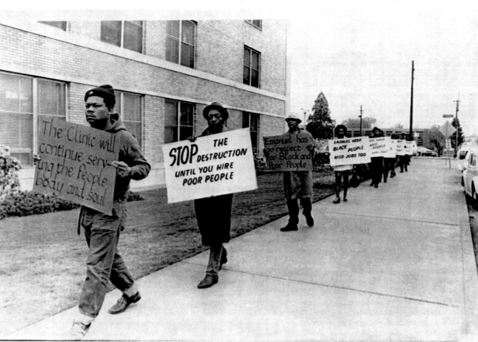 Protesters march outside Emanuel Hospital in 1971, demanding jobs for the community and keeping a health clinic open. Photo: Oregon Historical Society