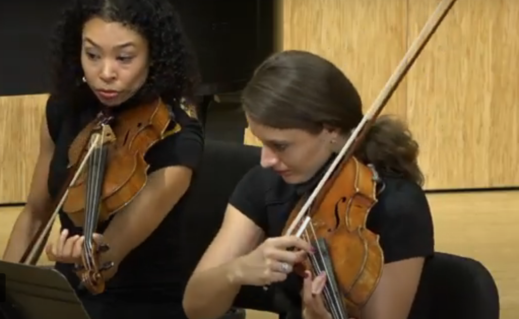 Composer and violist Nokuthula Ngwenyama, left, performing with the Dover Quartet’s Milena Pajaro-van de Stadt in Chamber Music Northwest’s premiere of Ngwenyama’s “Primal Message” in 2018. Fear No Music’s Kenji Bunch and Monica Ohuchi will play music by Ngwenyama, Regina Harris Baiocchi, and Adolphus Hailstork.