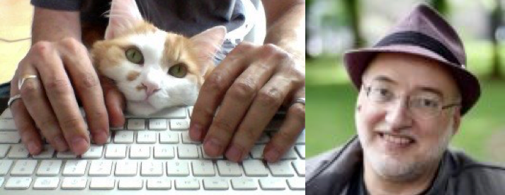 ArtsWatch Puzzlemaster Brett Campbell (right) trying (left) to work around a former head of the household, Kucing, who after an adventurous nine lives has passed his story-supervisor duties on to Bowie (stage name C.S. Eliot). How does Brett manage the workaround? It’s a puzzlement.
