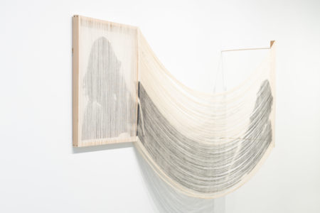 Yamahira begins by applying a coat of acrylic paint, graphite or transferring a silkscreen image to the surface of the canvas. Then, with a process that is the obverse of weaving, he deconstructs all or part of the canvas, meticulously and painstakingly removing individual threads from the weave of the canvas using an X-Acto knife, unweaving and exposing the warp (vertical) and weft (horizontal) components, so that the strands of cotton fiber drape loosely or stretch tautly across the wood stretcher bars. He then progressively disrupts the rectangularity of the grid by dividing the canvas into sections, deconstructing all or part of the canvas, hanging panels off kilter on a diagonal, allowing loose fibers to drape towards the floor, projecting part of an artwork off the wall, or suspending one piece from the ceiling.