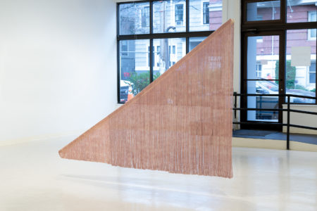 The most sculptural piece in the exhibition hangs suspended from the ceiling. Originally a triangular canvas painted pink, it has been completely deconstructed and then folded so that the fibers descend in straight vertical lines from the wood support, causing them to sway gently as visitors pass.